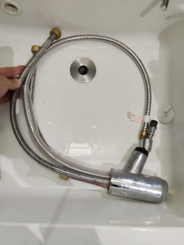 水とお湯の元栓を閉めてから、それぞれのホースを取り外します。