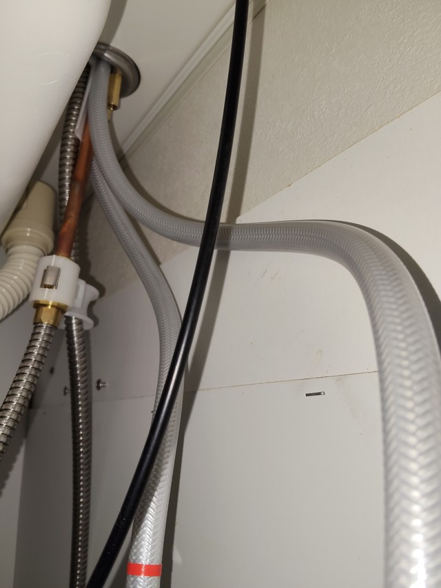 旧型はホースに赤い線と青い線が入っていて区別していましたが、新型は温水側に赤いテープが貼ってあるだけです。