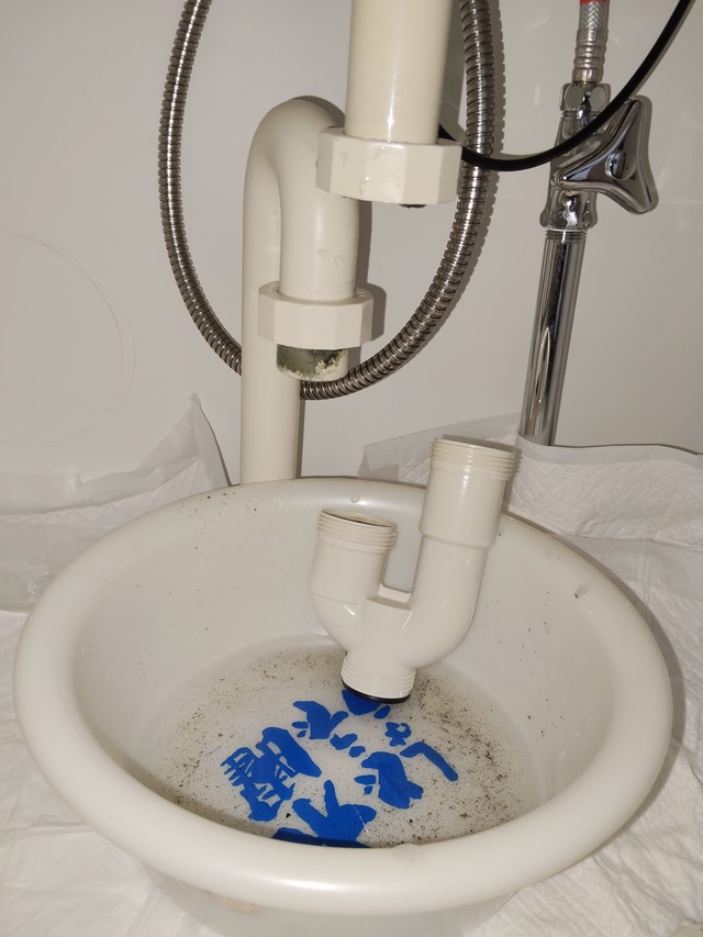 排水トラップの下側には水抜きがあるので、まずはそこから水を抜きます。